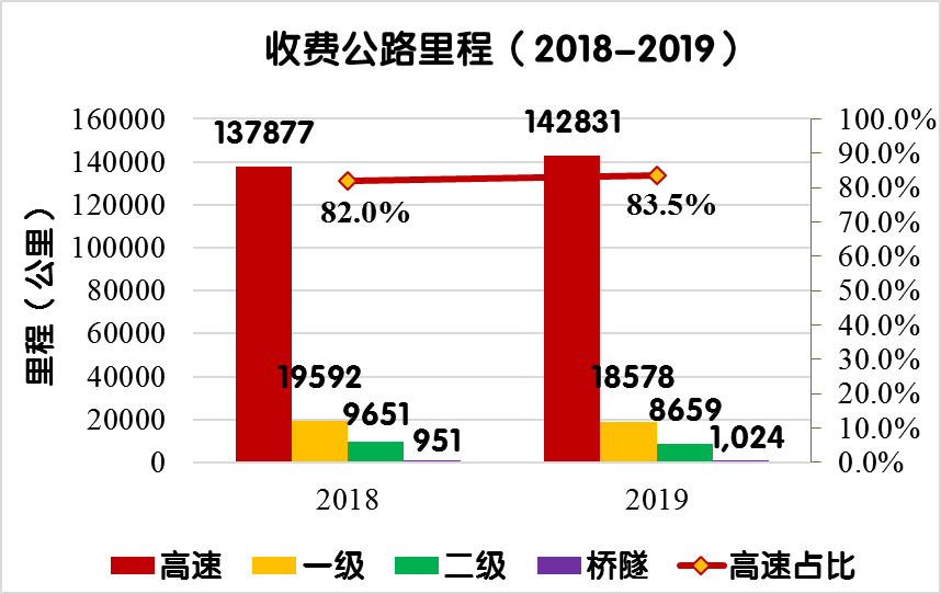 2019年末,全國收費(fèi)公路里程17.11萬公里,占公路總里程501.25萬公里的3.4%。其中,高速公路14.28萬公里,一級(jí)公路1.86萬公里,二級(jí)公路0.87萬公里,獨(dú)立橋梁及隧道1024公里,占比分別為83.5%、10.9%、5.1%和0.6%。