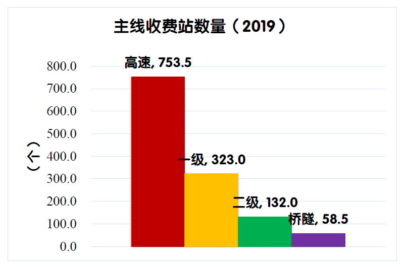 2019年末,全國收費(fèi)公路共有主線收費(fèi)站1267個(gè),比上年末凈減少49個(gè)。其中,高速公路753.5個(gè),一級(jí)公路323個(gè),二級(jí)公路132個(gè),獨(dú)立橋梁及隧道58.5個(gè),占比分別為59.5%、25.5%、10.4%和4.6%。