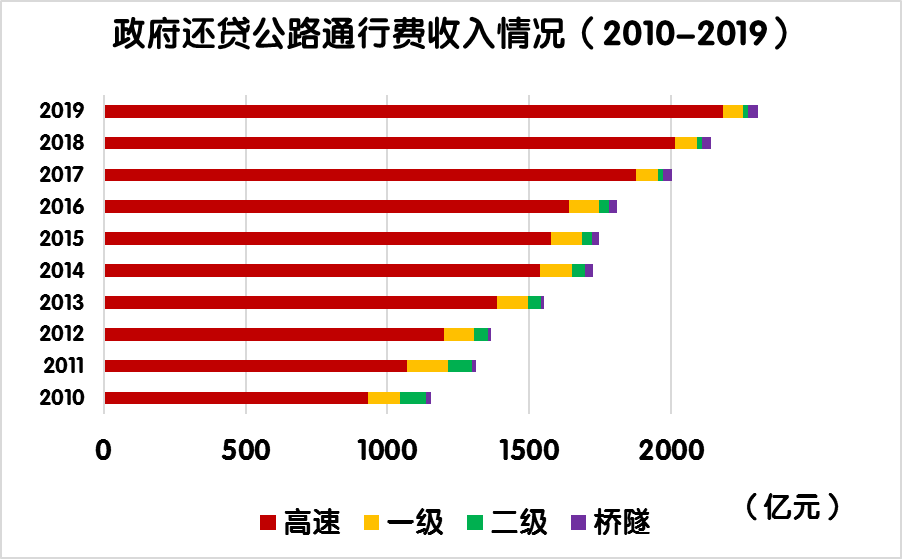 與上年末相比,政府還貸公路總里程由93257公里增加到93872公里,凈增615公里,增長0.7%。其中,高速公路里程由72578公里增加到74458公里,凈增1880公里,增長2.6%;一級(jí)公路里程由15132公里減少到14431公里,凈減701公里,下降4.6%;二級(jí)公路里程由5345公里減少到4797公里,凈減547公里,下降10.2%;獨(dú)立橋梁及隧道里程由203公里減少到186公里,凈減17公里,下降8.4%。