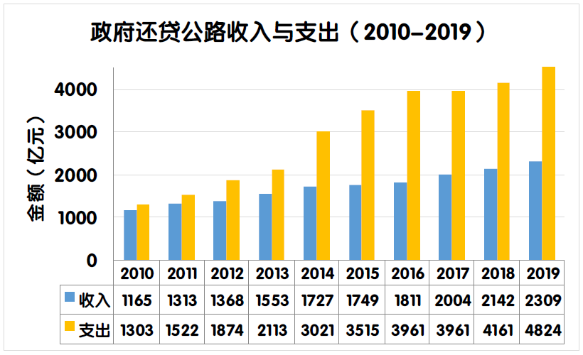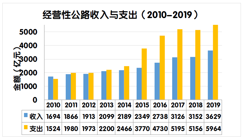 2019年度,全國收費(fèi)公路收支平衡結(jié)果為-4849.8億元。其中,高速公路收支缺口4673.9億元,一級(jí)公路收支缺口176.3億元,二級(jí)公路收支盈余2.0億元,獨(dú)立橋梁及隧道收支缺口1.6億元。