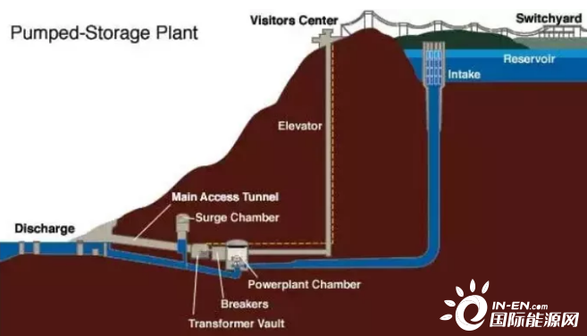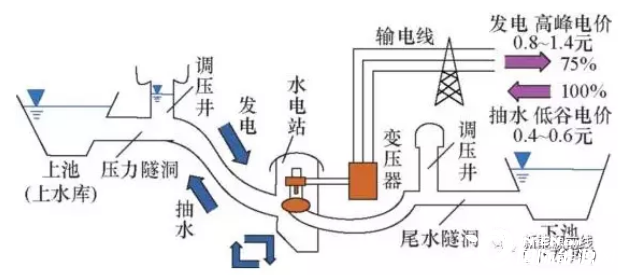 電網(wǎng)低谷時(shí)利用過剩電力將作為液態(tài)能量媒體的水從低標(biāo)高的水庫(kù)抽到高標(biāo)高的水庫(kù),電網(wǎng)峰荷時(shí)高標(biāo)高水庫(kù)中的水回流到下水庫(kù)推動(dòng)水輪機(jī)發(fā)電機(jī)發(fā)電。