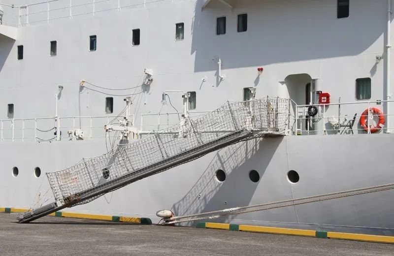 根據(jù)新生效的GB/T11701-2021《船用舷梯的基本規(guī)定》(3月1日起施行),舷梯主要分為兩類: (1)旋轉(zhuǎn)平臺(tái)式舷梯 單節(jié)舷梯、多節(jié)舷梯或伸縮舷梯的結(jié)構(gòu)與上面的旋轉(zhuǎn)平臺(tái)鉸接,可在船與登梯底面之間改變方向和傾斜角度。舷梯可用鋼絲繩或鏈從較低的(各)懸掛點(diǎn)掛住,或用固定在舷梯底部滾柱支持。 (2)固定平臺(tái)式舷梯 單節(jié)舷梯、多節(jié)舷梯或伸縮舷梯的結(jié)構(gòu)與上面的固定平臺(tái)鉸接,可在船和登梯底面之間改變傾斜角度。舷梯用鋼絲繩或鏈從較低的(各)懸掛點(diǎn)掛住,單獨(dú)使用的引航員舷梯采用此固定平臺(tái)式舷梯。 根據(jù)SOLAS第II-1章第3-9條款,凡是2010年1月1日及以后建造的船舶,必須在船上安裝經(jīng)認(rèn)可的登/離船設(shè)施,以備在港口或港口相關(guān)操作時(shí)使用。 該登/離船設(shè)施必須根據(jù)MSC.1/Circ.1331通函的要求進(jìn)行建造、測(cè)試、安裝及維護(hù),主要包括以下八點(diǎn)要求: (1)登/離船設(shè)施應(yīng)遠(yuǎn)離工作區(qū)域以及貨物或其它物體懸掛吊裝時(shí)可能通過(guò)上方的區(qū)域,該登/離船設(shè)施的目的和使用方式與引水員登 / 離船裝置是不同的; (2)應(yīng)提供足夠的照明,以照亮登/離船設(shè)施、甲板上人員登/離船和裝置控制的位置; (3)當(dāng)?shù)?離船裝置在使用時(shí),在其附近應(yīng)備有一只帶有自亮浮燈和救生浮索的救生圈(注意這里是要求一只救生圈既配備有自亮浮燈又配備有救生浮索,并且處于隨時(shí)可用狀態(tài)); (4)每部舷梯應(yīng)具有在其最大操作傾斜角時(shí),下平臺(tái)在最輕載水線以上不大于600mm的高度; (5)在每部舷梯或跳板梯的兩端應(yīng)設(shè)置一塊標(biāo)記牌,以清楚顯示安全操作和負(fù)荷限制,包括最大和最小允許設(shè)計(jì)傾斜角、設(shè)計(jì)負(fù)荷、最大底端板負(fù)荷等,如果最大操作負(fù)荷小于設(shè)計(jì)負(fù)荷,則最大操作負(fù)荷也應(yīng)顯示在標(biāo)記牌上; (6)跳板梯使用時(shí)安放水平傾斜角不應(yīng)大于30度和舷梯使用時(shí)水平傾斜角不應(yīng)大于55度; (7)在人員從登/離船設(shè)施或船舶與碼頭之間可能墜落的舷梯下應(yīng)安放安全網(wǎng); (8)正確設(shè)置舷梯下平臺(tái)的安全插銷。 收放前:應(yīng)對(duì)升降機(jī)械、鋼絲繩、滑車轉(zhuǎn)盤平臺(tái)支架等進(jìn)行檢查,確認(rèn)設(shè)備完好,鋼絲、卷筒、吊梁無(wú)障礙后方可作業(yè)。 收放過(guò)程中: (1)船靠離碼頭收放舷梯過(guò)程中,應(yīng)有專人指揮,作業(yè)人員默契配合。在浮動(dòng)的梯子上進(jìn)行收起、安裝欄桿、護(hù)繩作業(yè)時(shí),應(yīng)先檢查平臺(tái)支架是否已可靠支好,并使用止蕩索,上舷梯操作人員必須系好安全帶,穿好救生衣。 (2)舷梯落岸下踏板應(yīng)避開(kāi)障礙物,安放平穩(wěn),嚴(yán)禁扭曲。吊梁、鏈條要注意絞高或安放妥當(dāng),以免碰頭和妨礙上下船。 (3)由于潮夕、裝卸貨、碼頭環(huán)境等因素影響,舷梯不能放置碼頭時(shí),要注意隨時(shí)調(diào)整舷梯高度。當(dāng)舷梯下踏板離碼頭較高較遠(yuǎn)時(shí),不允許勉強(qiáng)上下。梯口值班人員負(fù)責(zé)調(diào)整舷梯和提醒上下人員注意安全,必要時(shí)應(yīng)按規(guī)定加裝橋梯。 (4)由于漲落潮、移泊等原因需要松緊纜繩時(shí),應(yīng)絞起舷梯,收起橋梯,或?qū)H丝春锰菘诮谷藛T上下。在無(wú)法使用舷梯時(shí),要正確地搭設(shè)橋梯,必須綁扎牢固、裝妥扶手、掛好安全網(wǎng)后人員方可上下。禁止從船舷直接跳上碼頭,或從碼頭直接跳上船。 (5)舷梯、橋梯必須按規(guī)定張掛安全網(wǎng)。舷梯、橋梯處應(yīng)有防墜落、防滑等安全指示標(biāo)志。舷梯、橋梯的扶手、扶繩、階梯必須保持清爽、干凈、牢固,便于上下人員抓牢、踏實(shí)。 (6)禁止用舷梯吊運(yùn)物品,禁止超載。