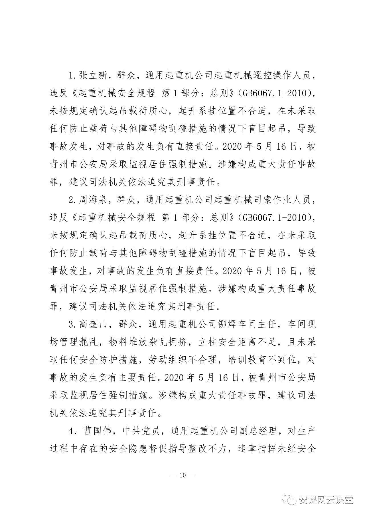 曹國偉,中共黨員,通用起重機公司副總經(jīng)理,對生產(chǎn)過程中存在的安全隱患督促指導(dǎo)整改不力,違章指揮未經(jīng)安全教育培訓(xùn)的工人上崗作業(yè),對事故的發(fā)生負有主要責任。