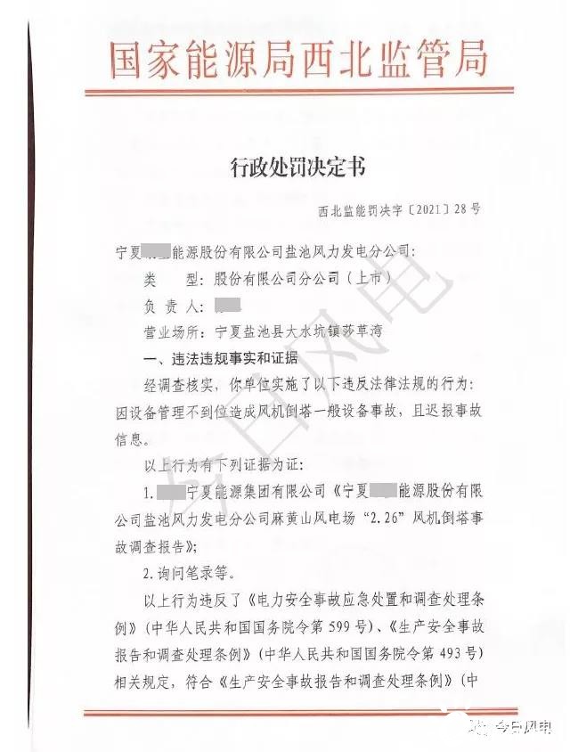 近日,國家能源局西北監(jiān)管局發(fā)布【2021】28號行政處罰決定書,根據(jù)該處罰決定,因設(shè)備管理不到位造成風(fēng)機(jī)倒塔一般設(shè)備事故,且遲報事故信息,根據(jù)《生產(chǎn)安全事故報告和調(diào)查處理?xiàng)l例》(中國人民共和國國務(wù)院令493號)第三十七條規(guī)定,對寧夏銀星能源股份有限公司鹽池風(fēng)力發(fā)電分公司罰款10萬元。