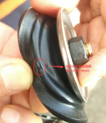 14、氣化器系統(tǒng)(含氣化器出口減壓閥)氣密性試驗(yàn)情況:經(jīng)淮南市特種設(shè)備監(jiān)督檢驗(yàn)中心安全閥校驗(yàn)站使用0.5MPa壓縮空氣對(duì)氣化器系統(tǒng)進(jìn)行氣密性試驗(yàn),發(fā)現(xiàn)減壓中間頸部呼吸孔處泄露,后拆解減壓閥,發(fā)現(xiàn)該減壓閥內(nèi)橡膠隔膜破損,高壓側(cè)氣體直接通過破損的橡膠隔膜排出。